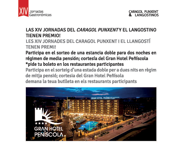 Participa en el sorteo de una estancia doble para dos noches en régimen de media pensión. Cortesía del Gran Hotel Peñíscola. Pide tu boleto en los restaurantes participantes.